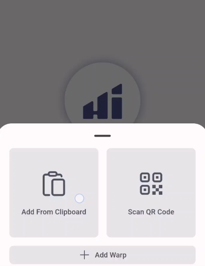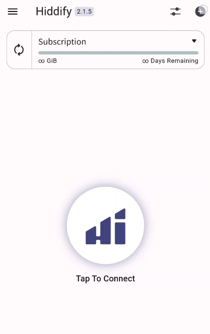 ۱- بعد از نصب اپلیکیشن هیدیفای و کپی اشتراک از ربات، اپلیکیشن رو باز کنید. دکمه + بالای اپلیکیشن رو لمس کنید.